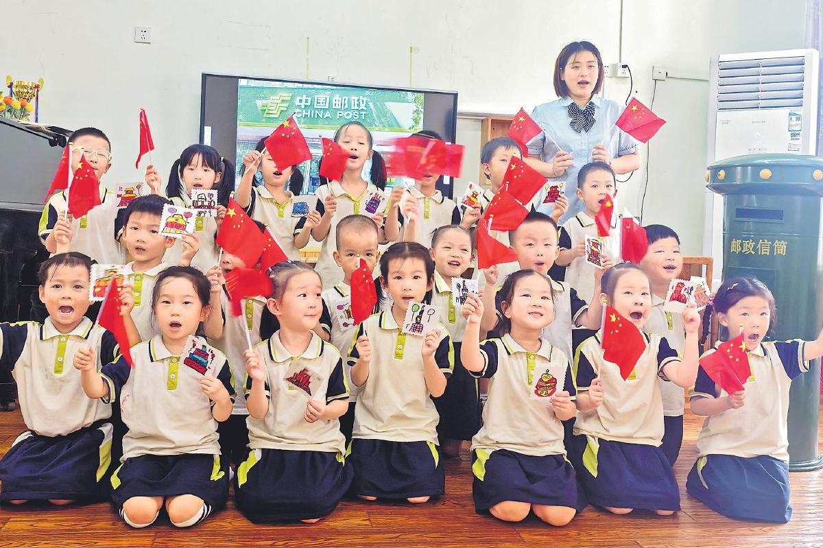 “十一”國慶節(jié)即將到來之際,為將愛國主義的種子深植心田,讓民族自豪感蓬勃生長,江蘇省南通市海門區(qū)郵政分公司聯(lián)合該區(qū)通源幼兒園開展“郵趣慶華誕”主題活動,通過辨識郵政業(yè)務(wù)、學(xué)做郵帽、手繪郵票和明信片等形式,讓孩子們體驗(yàn)豐富多彩的郵政文化,共同迎接中華人民共和國成立76周年。圖為該幼兒園小朋友手舉國旗和手繪的郵票圖案,齊聲祝福偉大祖國生日快樂。