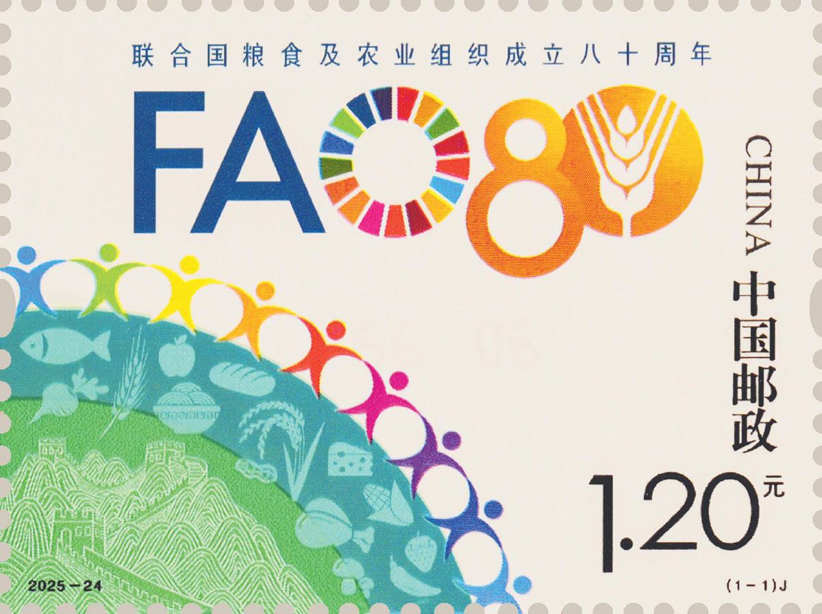 本套郵票圖案以聯(lián)合國糧食及農(nóng)業(yè)組織八十周年紀念標識為主體,左側的藍色環(huán)形底色象征地球家園,前景展現(xiàn)了多樣美食以及象征中國的長城元素,結合并肩攜手的人物剪影,呼應2025年世界糧食日“手拉手共倡多樣美食,聚合力同創(chuàng)美好未來”主題。