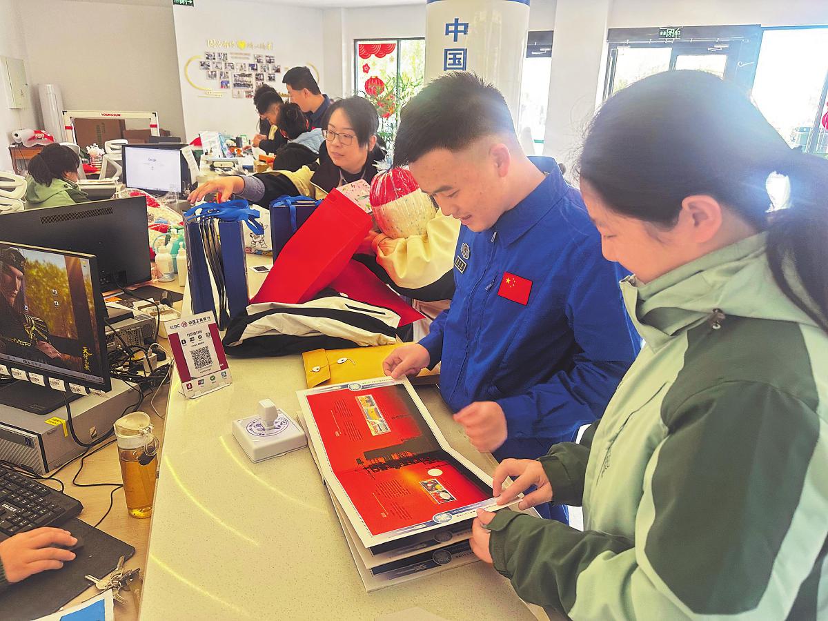 10月31日,搭載神舟二十一號載人飛船的長征二號F遙二十一運載火箭在甘肅酒泉衛(wèi)星發(fā)射中心成功發(fā)射。為記錄中國航天事業(yè)的輝煌成就,酒泉市郵政分公司推出“2025筑夢太空”系列郵品,既具有航天發(fā)射的紀(jì)念意義,又兼顧集郵愛好者關(guān)注的收藏價值,受到各界的歡迎。圖為在酒泉航天主題郵局,客戶們踴躍選購航天郵品。