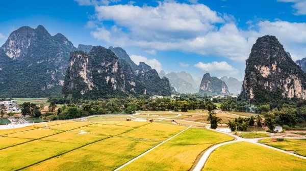 金色稻浪與喀斯特峰林相映成一派“豐”景