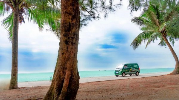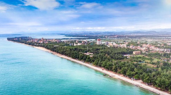 椰林伴海,郵車(chē)穿行于萬(wàn)尾金灘的濱海道