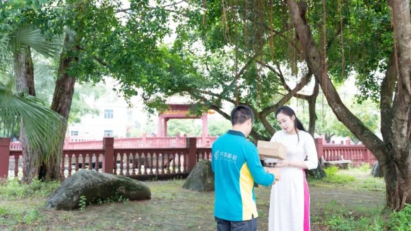 京族村寨中,身著民族服飾的姑娘接過(guò)投遞員送來(lái)的包裹