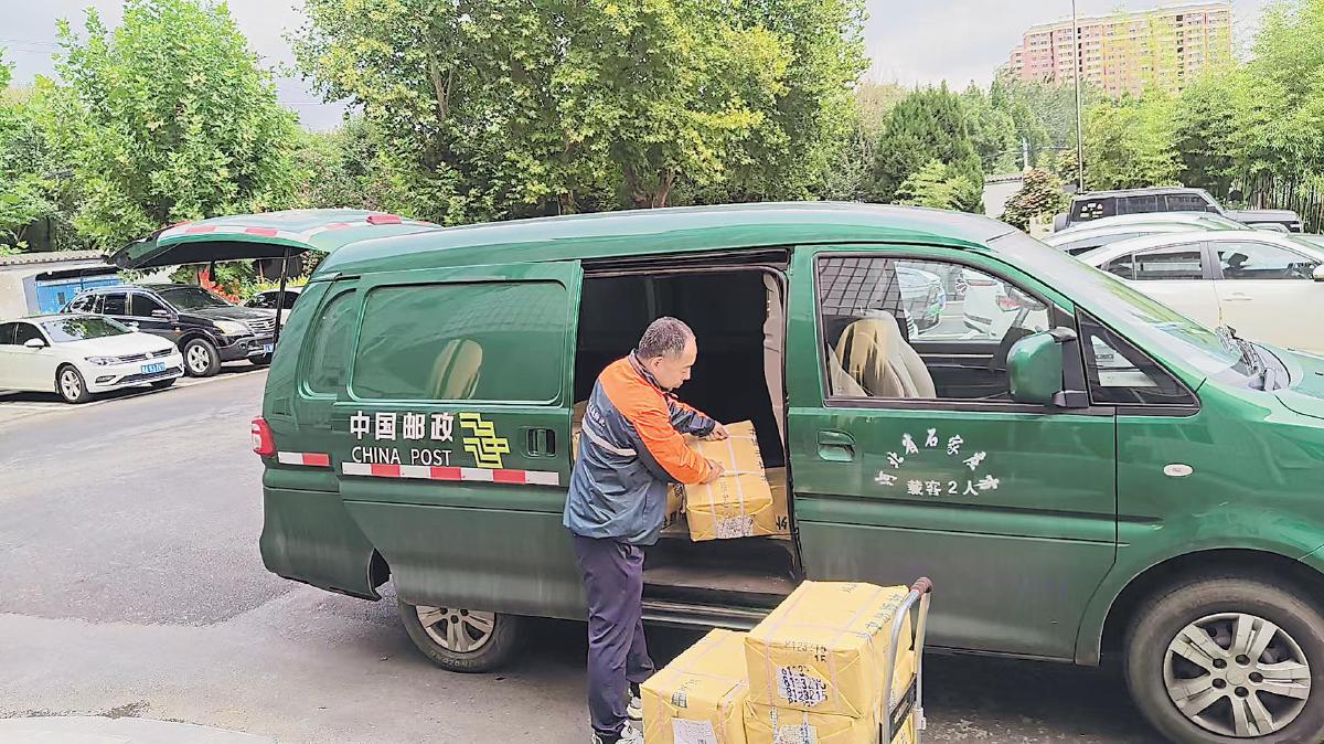 河北石家莊市分公司攬投員將重點(diǎn)政務(wù)圖書搬上郵車準(zhǔn)備配送。