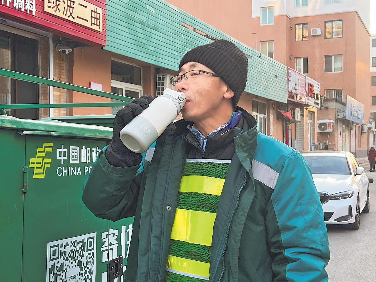 投遞路上,攬投員李洪巖用上了工會(huì)送來的生日禮物。□劉柏君 攝