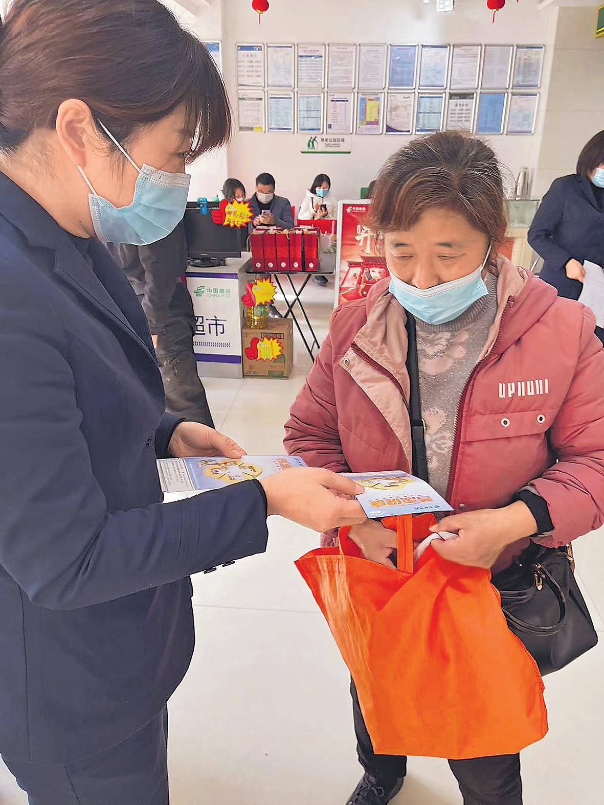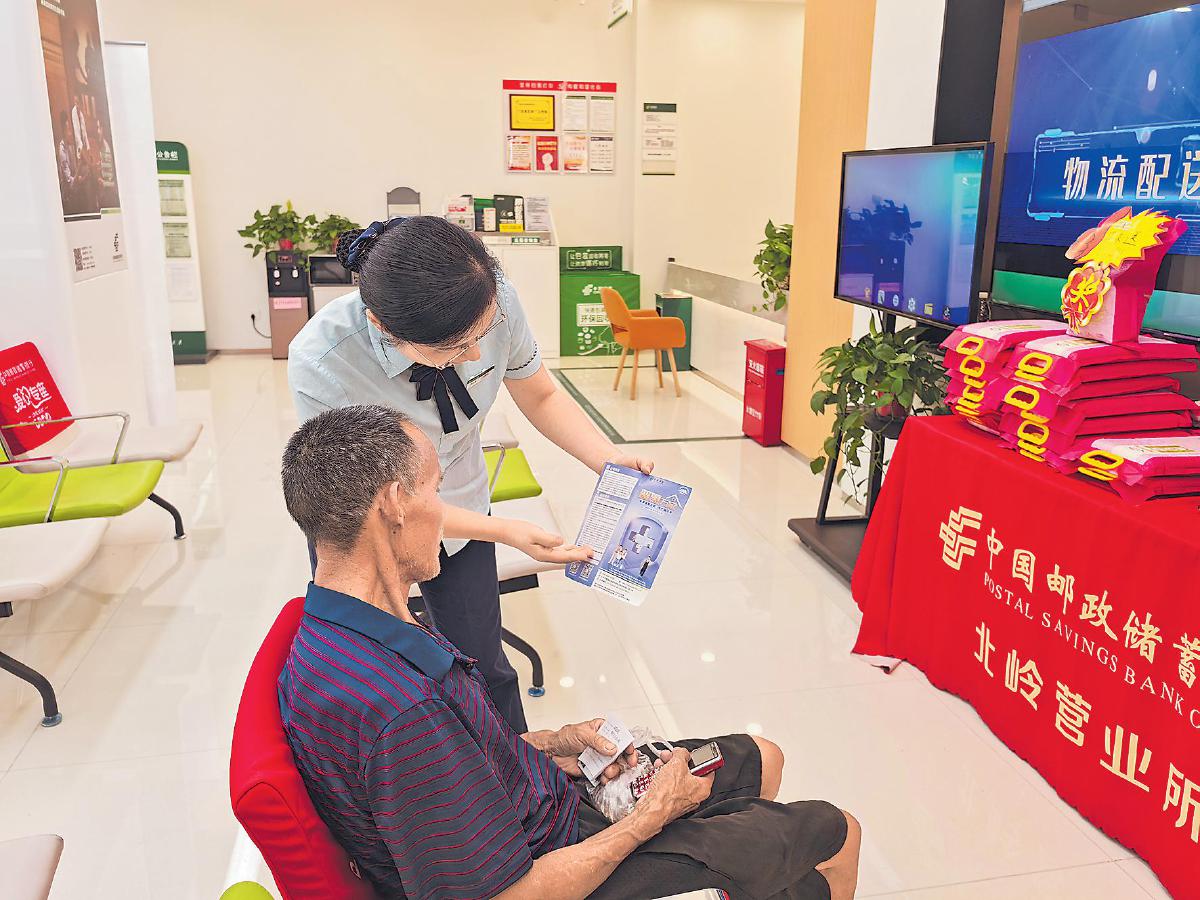 針對老年群體需求,郵政工作人員宣傳定制化普惠保險業(yè)務(wù)。