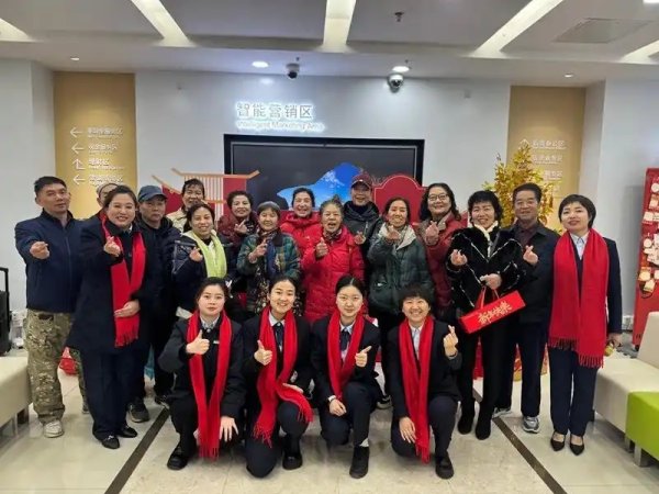活動(dòng)尾聲,每位參與者手中都緊握著福字與春聯(lián),客戶(hù)與工作人員圍攏合影,有人比出“耶”的手勢(shì),有人高高豎起大拇指,紅圍巾在鏡頭前連成一片溫暖的底色。