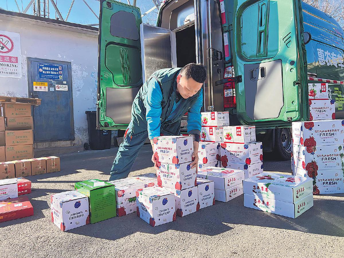 清晨5點半,京北田野尚未完全蘇醒,位于北京市昌平區(qū)的草莓大棚里已是人影綽綽。手電筒的光束劃過翠綠的葉壟,照出一顆顆鮮紅欲滴的果實,“紅顏”草莓正迎來一天中最關(guān)鍵的采摘時刻。果農(nóng)小心地將草莓放入墊著軟襯的籃中,攬收員左蒸蒸快步上前,接過還沾著晨露的果籃,驗視、稱重、錄入、封裝,動作一氣呵成?!霸蹅兊膶\嚨戎?。今天下午,這批‘紅顏’草莓就能出現(xiàn)在城里的餐桌上了?!睅追昼姾?,這批嬌嫩的果實便穩(wěn)穩(wěn)地裝入郵車,開啟了一場關(guān)于速度與新鮮的奔赴。