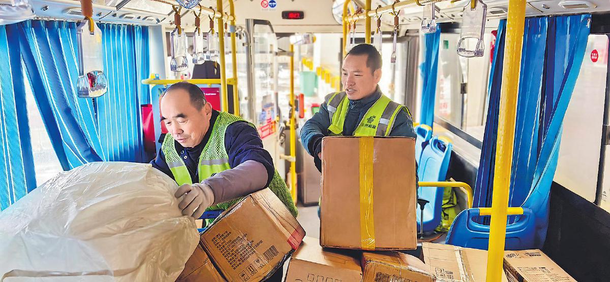 古井鎮(zhèn)郵政鎮(zhèn)級(jí)運(yùn)營(yíng)中心投遞員葉魏從公交車駕駛員手中接過(guò)待投包裹。