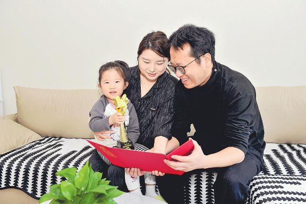 “我認識這個圖案,是1。爸爸,你真棒!”兩歲的女兒偎在張通懷里,指著獎杯開心地說。
