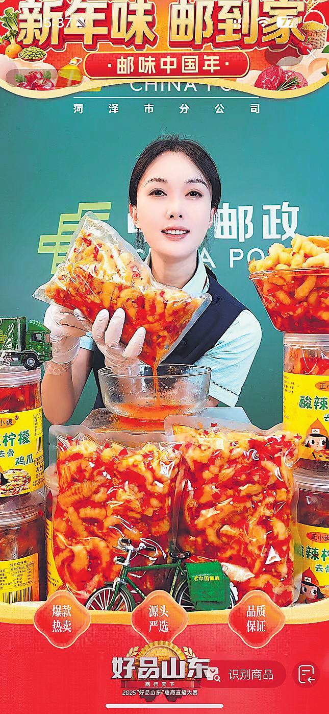 2025年11月,菏澤郵政啟動“年貨節(jié)”專項策劃,建立市、縣郵政聯(lián)動的選品機制,緊跟節(jié)日消費趨勢與網(wǎng)民偏好,在暢銷的酸辣無骨雞爪的基礎上,新增佤味雞爪等品類,持續(xù)優(yōu)化產(chǎn)品組合,精準對接市場需求。