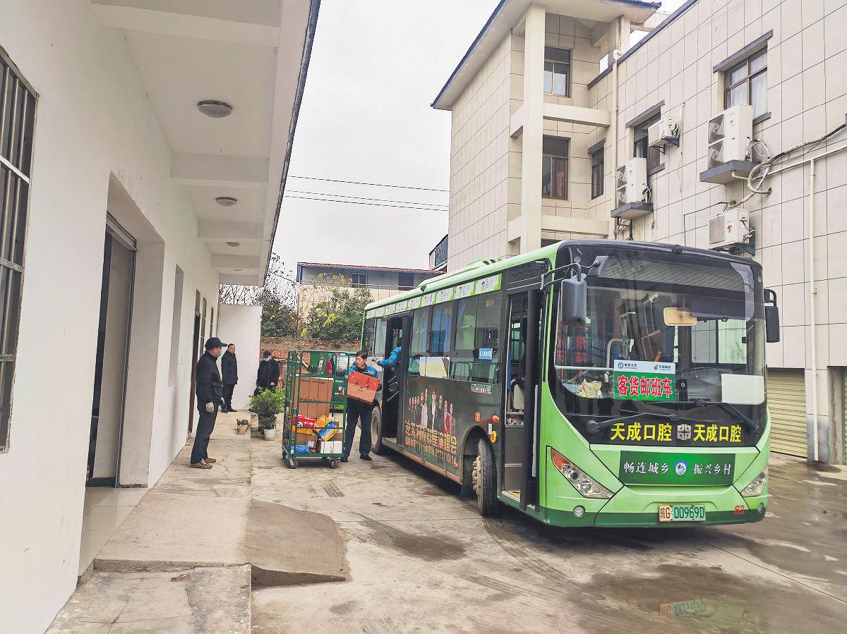 在樅陽縣會宮鎮(zhèn)農(nóng)村電商運(yùn)營中心,郵政投遞員卸下公交代運(yùn)的郵快合作郵件。
