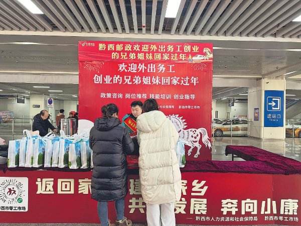 2月2日,貴州省黔西市郵政分公司聯(lián)合人社部門,在高鐵站為返鄉(xiāng)人員提供暖心服務?! 跣啞z