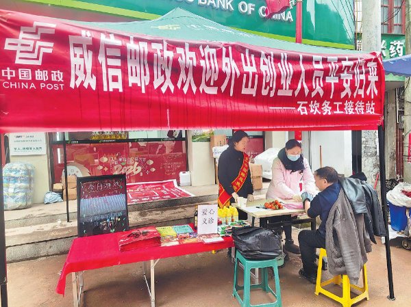 2月10日,云南省威信縣郵政分公司設立接待站,為返鄉(xiāng)人員提供義診服務?! 踵嵣ァz