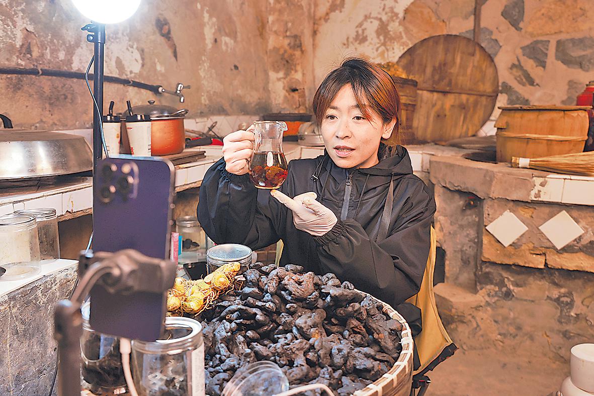 主播“@鄉(xiāng)村夏天”在直播推銷當(dāng)?shù)靥禺a(chǎn)九制黃精。□吳俊杰 攝
