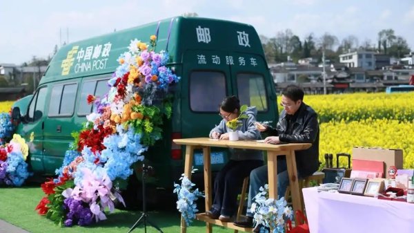 “金海雪山”因春季油菜花與漫山李花交相輝映而得名。今年,貴定郵政在去年基礎(chǔ)上優(yōu)化服務(wù),依托郵政流通服務(wù)車,將郵局搬進了花?!,F(xiàn)場劃分出打卡拍照區(qū)、文創(chuàng)展示區(qū)、明信片書寫寄遞區(qū)和助農(nóng)產(chǎn)品銷售區(qū),讓郵政文化與田園風光融為一體。