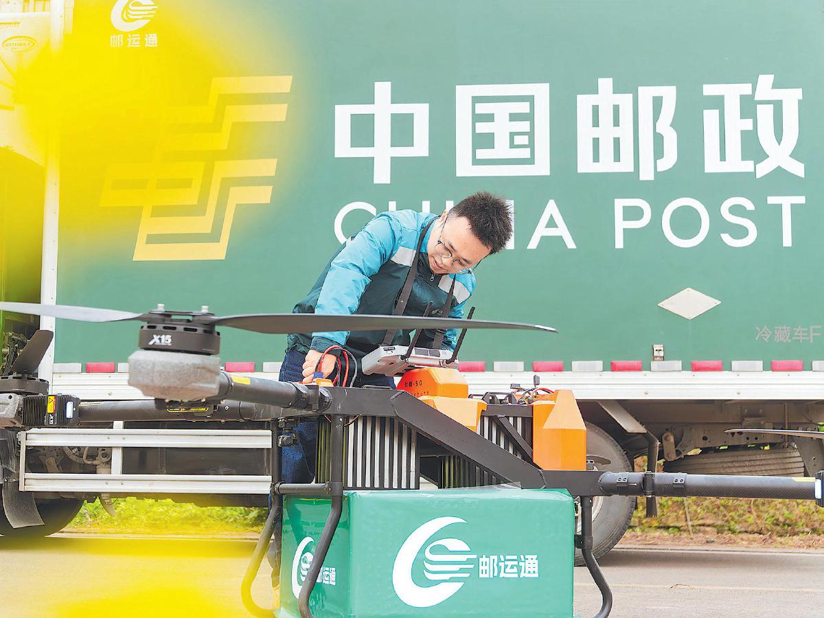 3月13日,重慶郵政飛控員在檢查無人機(jī),保障農(nóng)資精準(zhǔn)送達(dá)田間地頭。 □王金莊 攝