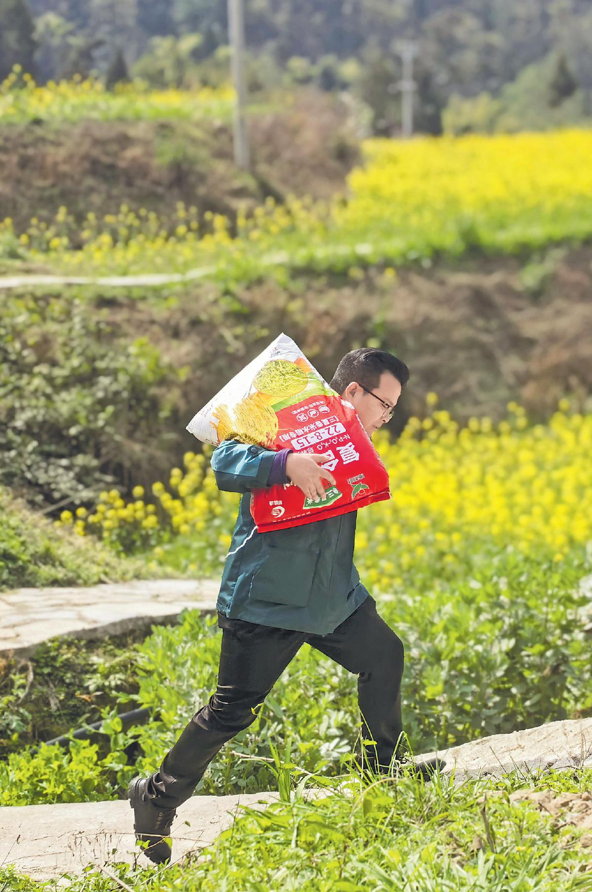 3月11日,郵政投遞員奔走在田埂間,搶農(nóng)時、保春耕,將農(nóng)資及時送到農(nóng)戶手中?! 跷很啊z