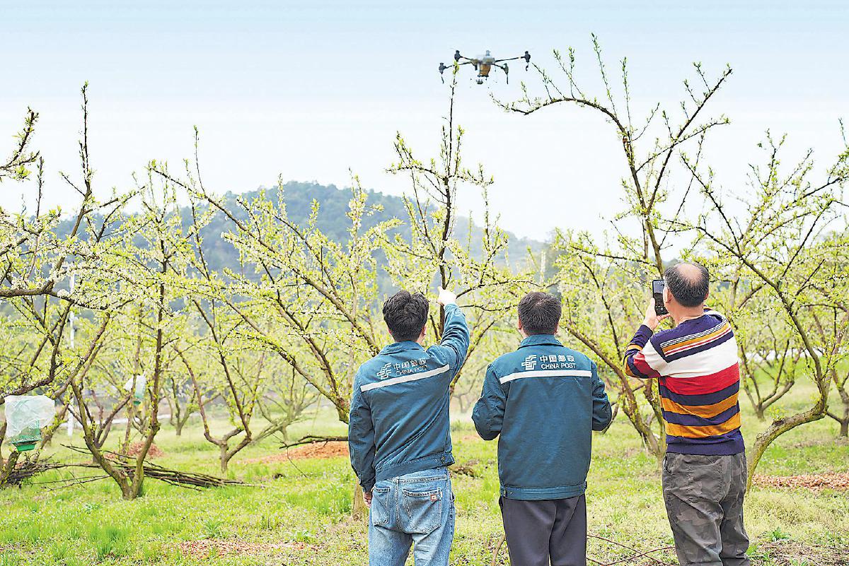 3月12日,江津區(qū)郵政分公司工作人員在柰李基地開展無人機(jī)植保作業(yè),助力果樹增產(chǎn)?! 跬醮禾m 攝
