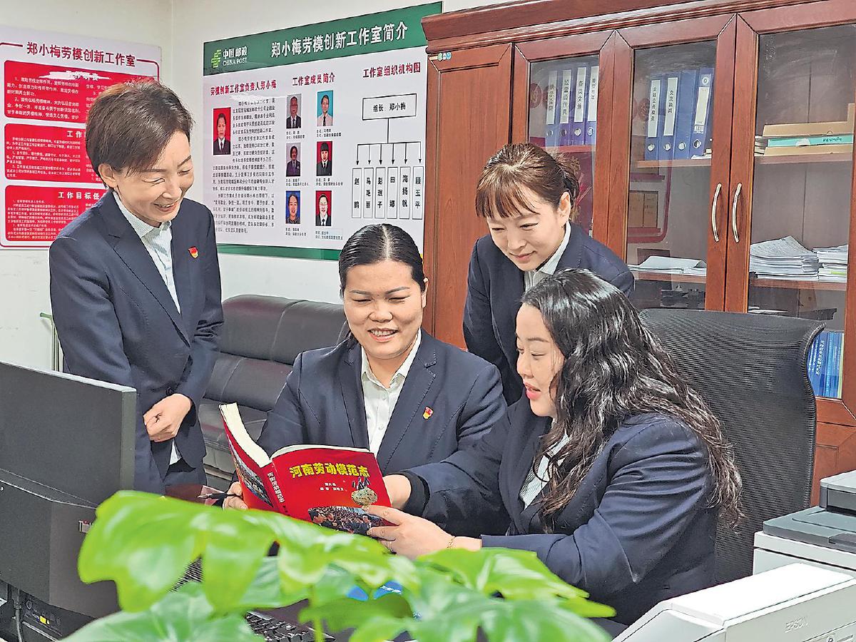鄭小梅(左二)與勞模創(chuàng)新工作室成員交流學(xué)習(xí)。