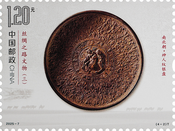 神人紋銀盤出土于甘肅省靖遠(yuǎn)縣北灘,藏于甘肅省博物館,是中國(guó)絲綢之路上發(fā)現(xiàn)的重要羅馬文物,據(jù)考證于公元四到五世紀(jì)傳入中國(guó)。盤內(nèi)壁滿飾浮雕花紋,分三圈列置。外圈飾勾連的葡萄卷草紋,其間棲有小鳥(niǎo)、蜜蜂等小動(dòng)物。中間一圈浮雕為古希臘奧林匹斯十二神的頭像,每個(gè)頭像左側(cè)各有一只動(dòng)物。中心為一高浮雕男性倚一花豹而坐。郵票采用啞沙和三維浮雕起凸工藝的融合應(yīng)用,呈現(xiàn)銀盤的細(xì)節(jié)特征和質(zhì)地紋理。此件器物發(fā)現(xiàn)于絲綢之路甘肅段的黃河渡口,是研究東西方經(jīng)濟(jì)文化交流交往的重要實(shí)物資料,也是十分罕見(jiàn)的絲綢之路遺珍。