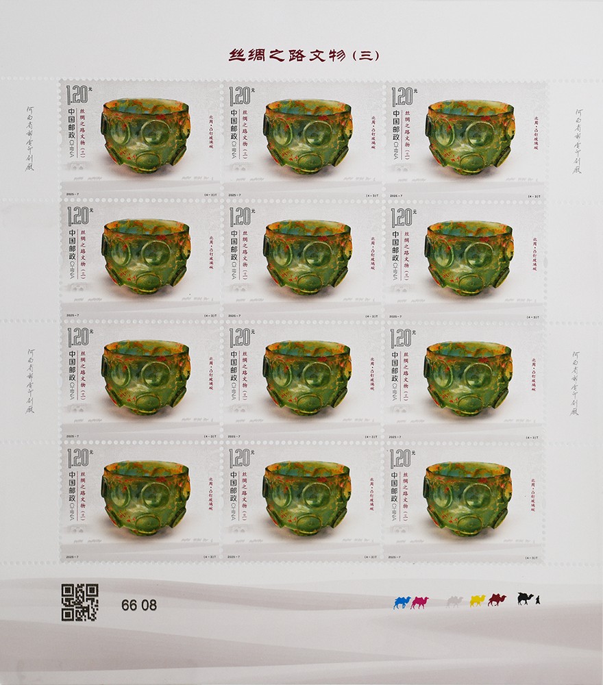 凸釘玻璃碗出土于寧夏固原市南郊的北周李賢夫婦合葬墓,現(xiàn)藏于寧夏回族自治區(qū)固原博物館。該碗為直口,矮圈足,通體透明,呈碧綠色,外壁飾以14個(gè)凸起的圓形裝飾兩周,上下錯(cuò)位排列。其內(nèi)壁光潔,外壁有薄層的金黃色分化物,其材質(zhì)屬鈣鈉玻璃,含有較多其它礦物質(zhì),該形制在薩珊時(shí)期的伊朗高原十分流行。郵票將特種光油和三維浮雕起凸組合應(yīng)用,玻璃碗晶瑩剔透的質(zhì)感和立體感躍然紙上。固原作為絲綢之路西北咽喉門戶,見(jiàn)證了東西方文化交流交融,提供了考察當(dāng)時(shí)東西方貿(mào)易極為重要的資料。