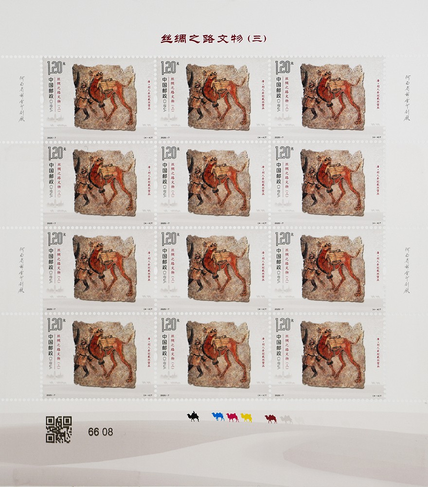 胡人牽駝?shì)d絲壁畫(huà)出土于河南省洛陽(yáng)市安國(guó)相王孺人唐氏墓,現(xiàn)藏于洛陽(yáng)古墓博物館。壁畫(huà)繪制在唐氏墓墓道西壁,正中一匹高大雄健的駱駝昂首挺胸、抬蹄甩尾、闊步前進(jìn)。駱駝背上,是捆扎好的絲綢卷和瓶子。前面牽韁繩的西域人高鼻梁、絡(luò)腮胡,頭戴尖帽,身著翻領(lǐng)長(zhǎng)衫,腳蹬黑色高靿靴,正邁步牽駝前行。該壁畫(huà)生動(dòng)再現(xiàn)了各國(guó)商人來(lái)到絲綢之路的東方起點(diǎn)之一洛陽(yáng),裝載絲綢西行走上絲綢之路的場(chǎng)景,客觀地反映了唐代的社會(huì)場(chǎng)景和世俗風(fēng)情,講述著文明交流互鑒的故事。郵票結(jié)合逆向上光和啞沙工藝,既展現(xiàn)出壁畫(huà)滄桑的歷史變遷,又突出壁畫(huà)中人物、飾物、動(dòng)物等不同的色彩效果,賦予其獨(dú)特的藝術(shù)氣質(zhì)。