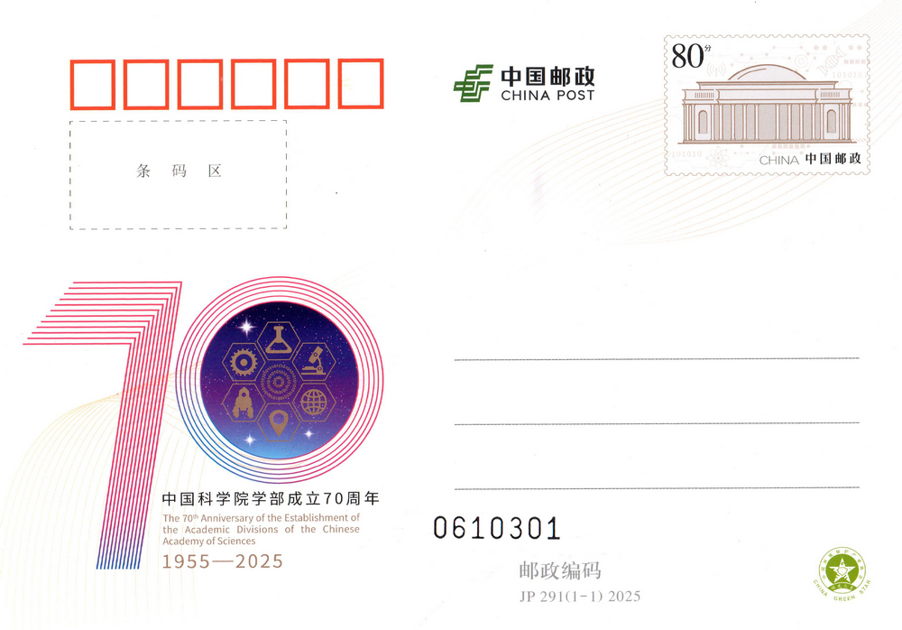 中國郵政定于2025年6月1日發(fā)行《中國科學院學部成立70周年》紀念郵資明信片1套1枚。詳情如下: