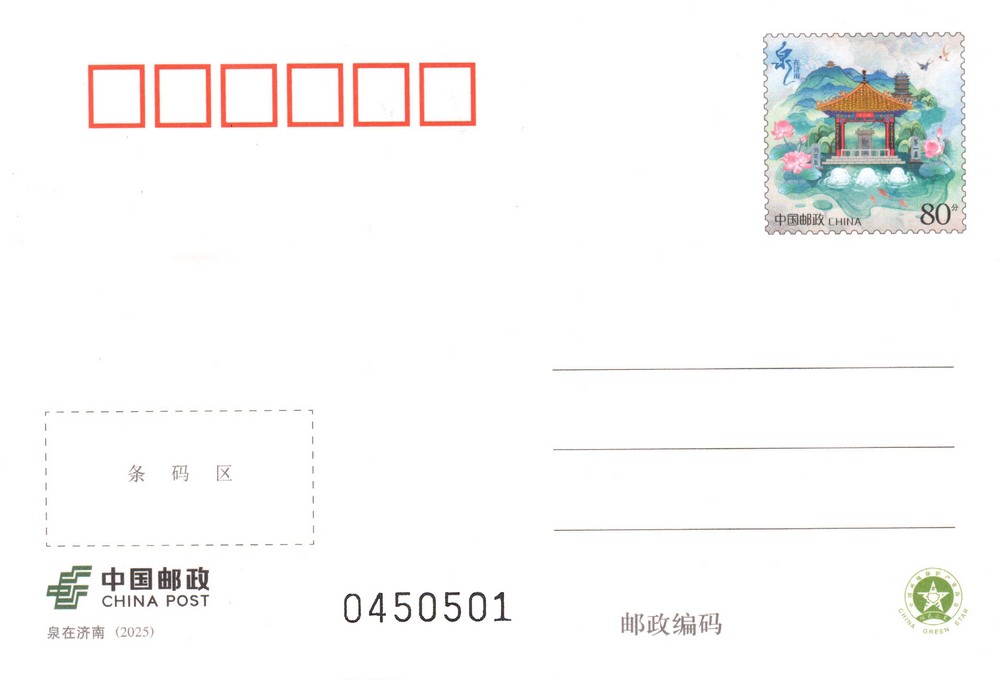 中國郵政定于2025年6月18日發(fā)行《泉在濟(jì)南》普通郵資信封1枚和普通郵資明信片1枚。詳情如下: