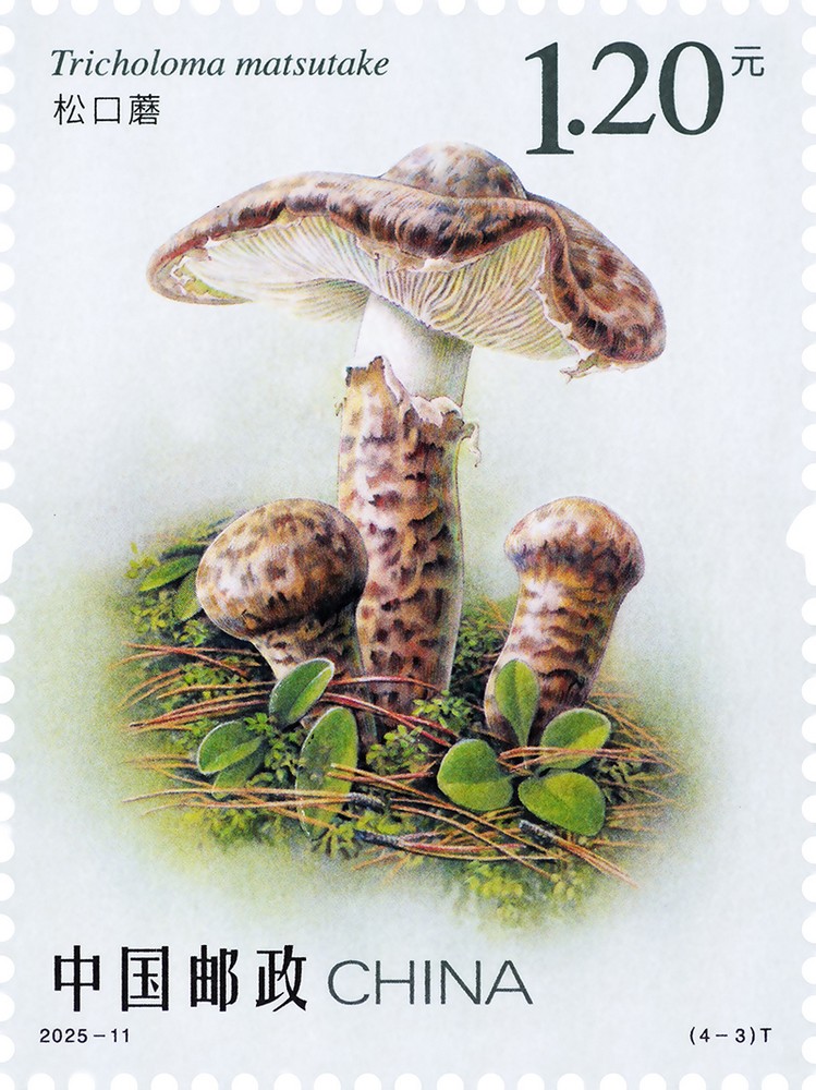 第三枚“松口蘑”,俗稱“松茸”,隸屬口蘑科,是世界公認(rèn)的珍稀名貴天然食用菌,同時也是我國二級瀕危保護(hù)物種。松口蘑歷來被譽(yù)為食用菌中的瑰寶,享有“蘑菇之王”的美譽(yù),珍貴無比。郵票采用細(xì)致的筆法刻畫松口蘑菌蓋表面的細(xì)微紋理及菌柄的粗壯形態(tài),同時背景加入松林元素,以柔和的光影表現(xiàn)其生長環(huán)境,增強(qiáng)畫面的自然氛圍。