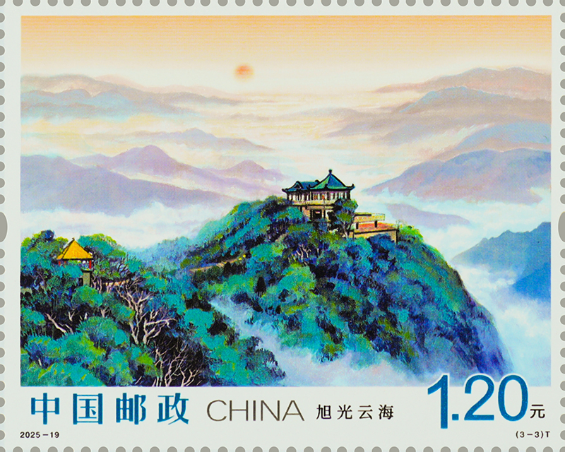 第三枚“旭光云?!保枥L了莫干山的日出景象。該枚郵票定格了莫干山旭日東升的壯麗景象,旭光臺作為莫干山觀賞日出的絕佳觀景臺,將天地交輝的盛景盡收眼底。遠山如黛,云濤似海,萬道金芒為連綿山巒披上錦袍,昭示著此刻的莫干山正以更輝煌的姿態(tài)擁抱嶄新的未來。