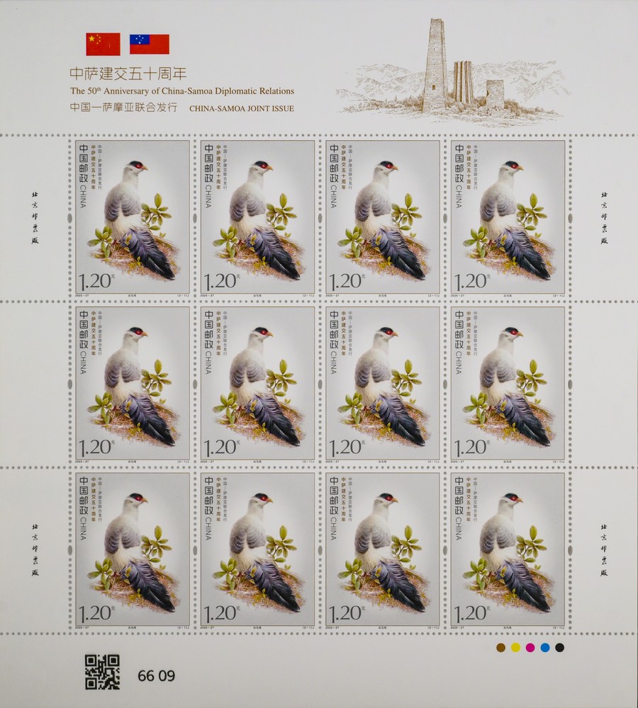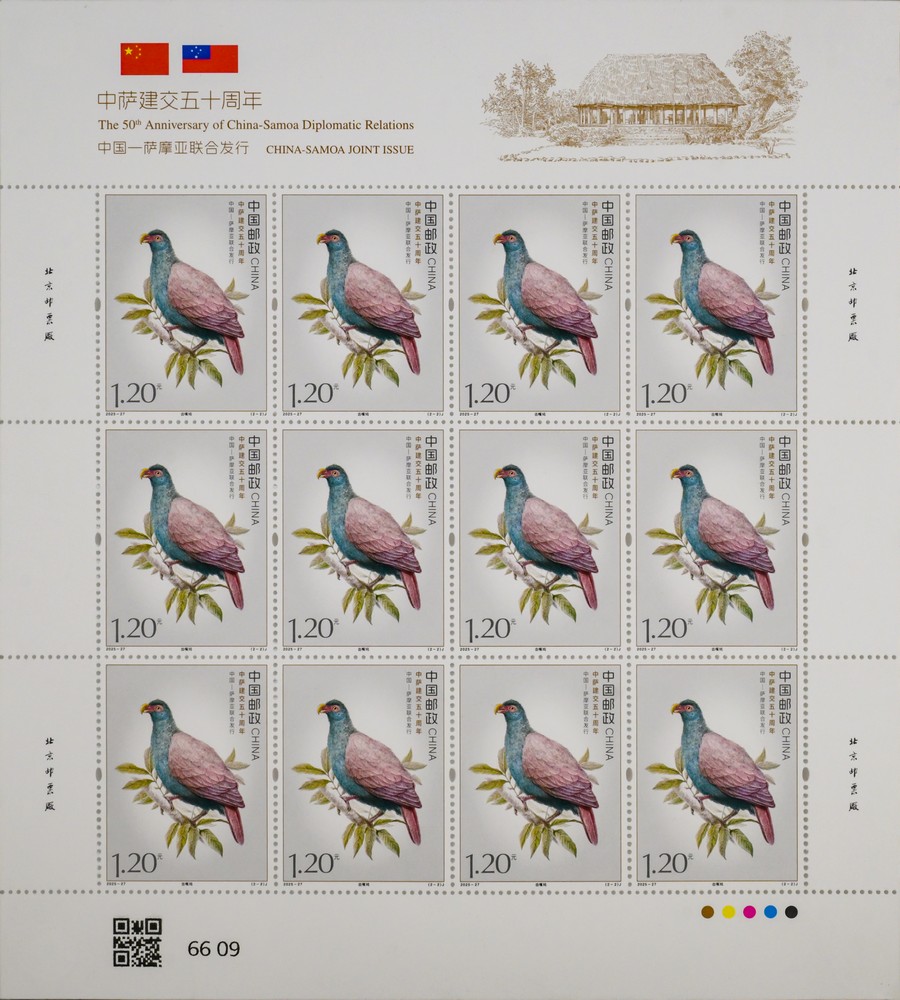 本套郵票以兩國的特色鳥類為核心設(shè)計元素,融西方鋼筆線條與東方淡彩的表現(xiàn)技法,筆觸細(xì)膩傳神,形象生動逼真,兩只禽鳥顧盼相應(yīng)、神氣貫連,洋溢著蓬勃的生命力。本套郵票既展現(xiàn)兩國獨特的自然生態(tài)之美,更傳遞出兩國友誼的深厚底蘊(yùn)與美好未來。第一枚郵票表現(xiàn)了“白馬雞”。作為四川丹巴莫斯卡鳥類重要棲息地的主要保護(hù)物種,白馬雞也成為丹巴自然生態(tài)的鮮活代表,當(dāng)?shù)鬲毺氐母咴瓪夂?、適宜的生態(tài)環(huán)境為其提供了理想生存空間。第二枚郵票表現(xiàn)了“齒嘴鳩”。作為薩摩亞的本土特有鳥類,齒嘴鳩不僅是當(dāng)?shù)厣鷳B(tài)系統(tǒng)的重要成員,更被視為薩摩亞自然與文化遺產(chǎn)的象征,承載著薩摩亞人民對家鄉(xiāng)土地的熱愛與珍視。